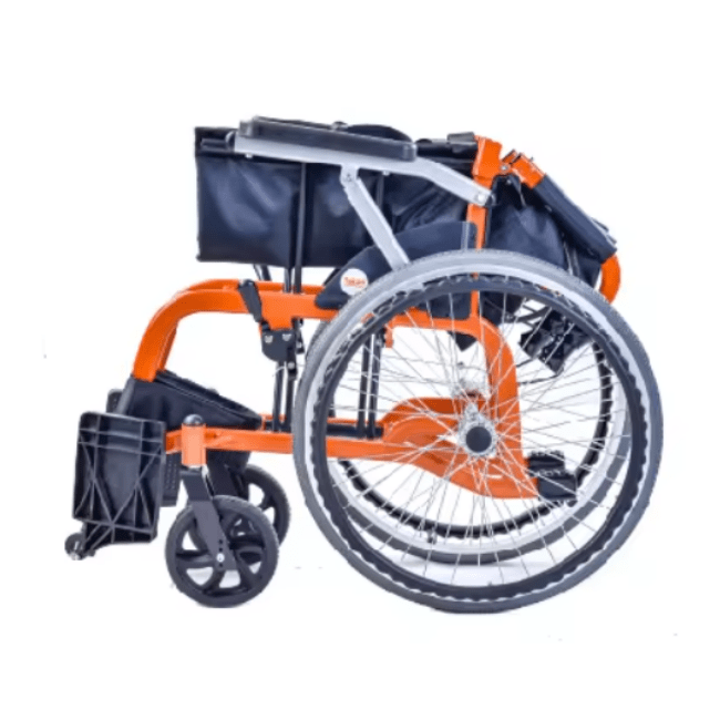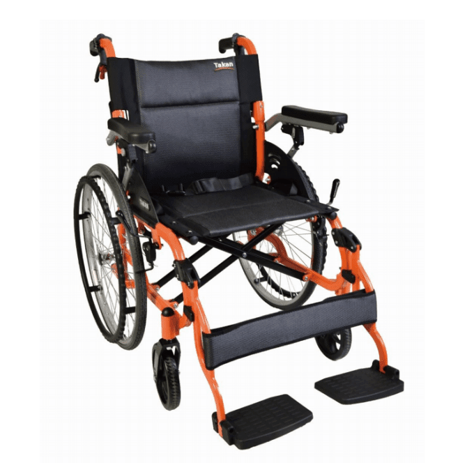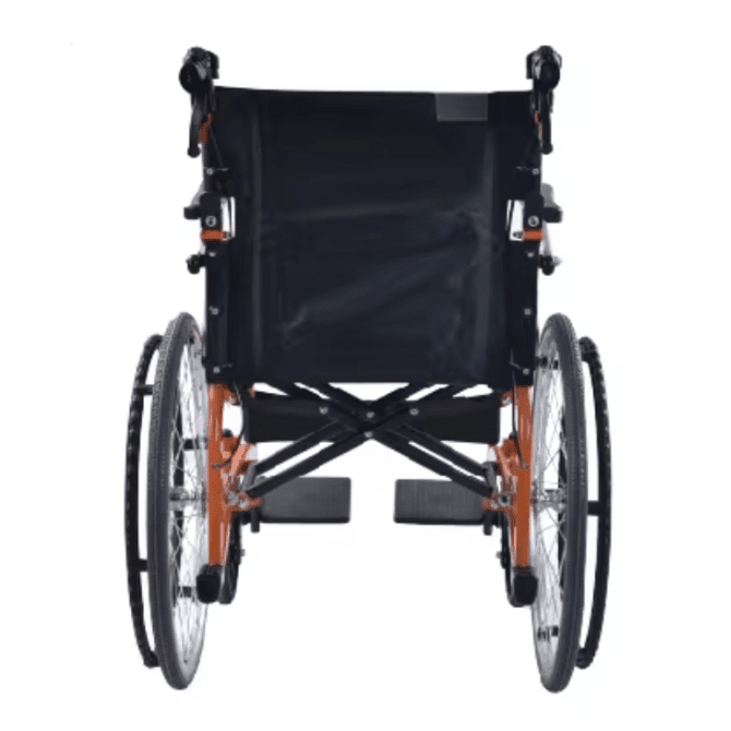 This orange wheelchair features flip armrests, adjustable safety belt, and foldable backrest. Notably, it offers active footrests and quick-release wheels for easy mobility and storage.