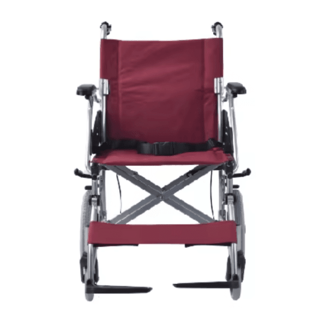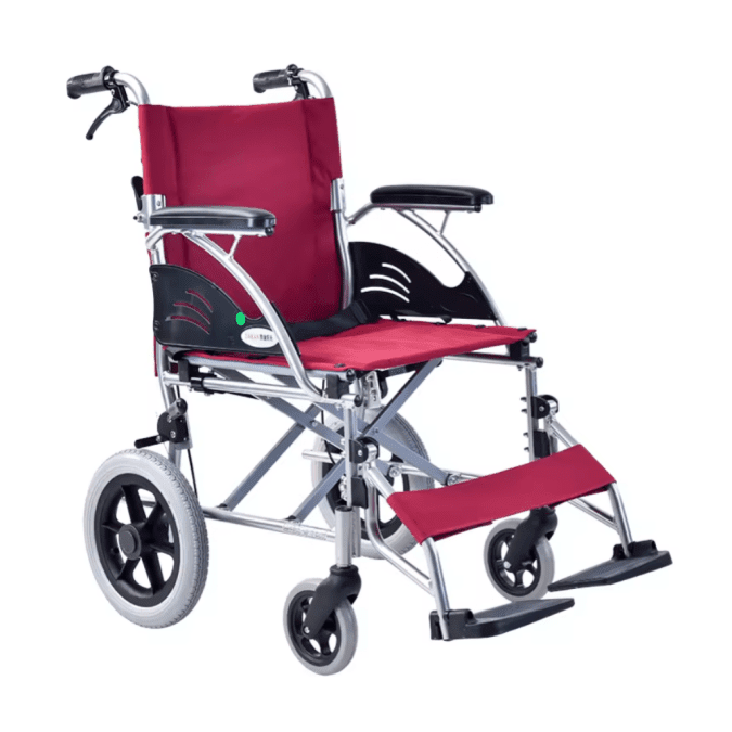 This wheelchair features a lightweight aluminum alloy frame with several comfort and safety designs, such as foldable backrest and portable brake functionality, suitable for users with various needs, and has a load capacity of 100kg.