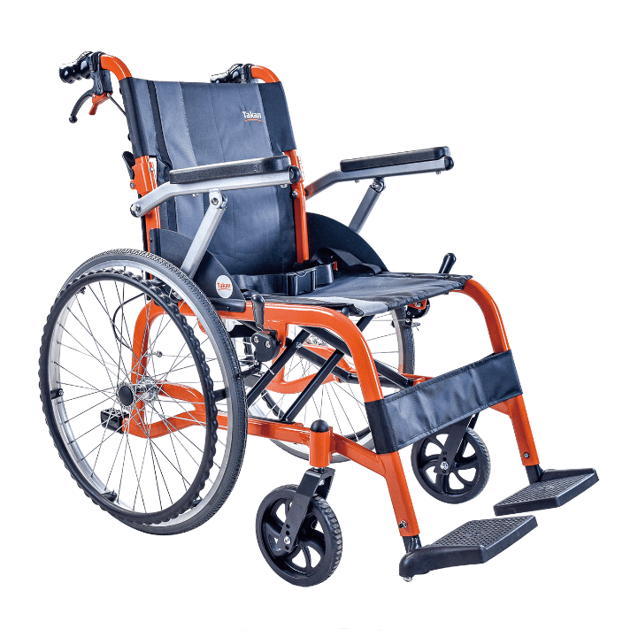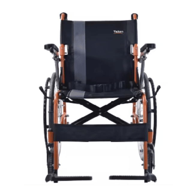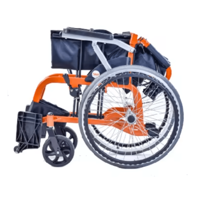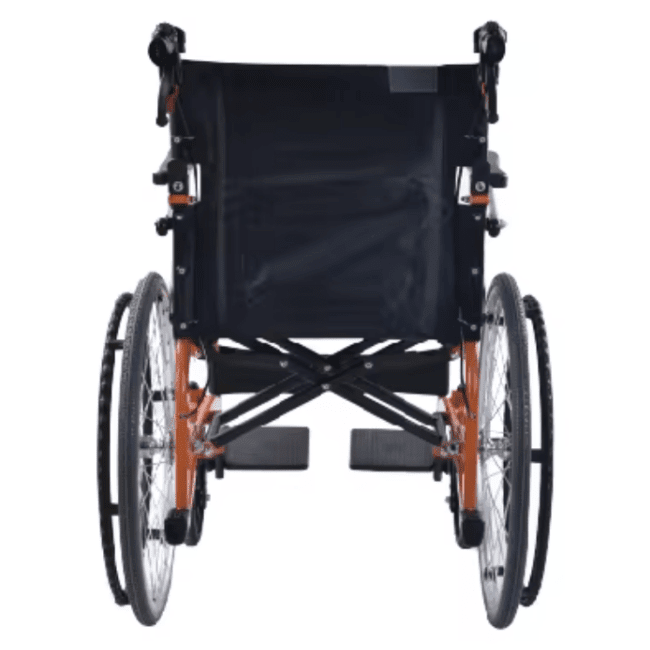 This wheelchair features a durable aluminum alloy frame with orange spray painting, equipped with rear flip armrests and a foldable back for space-saving convenience. It boasts an ergonomic design with a breathable back cushion, providing comfort and safety for users weighing up to 100kg.